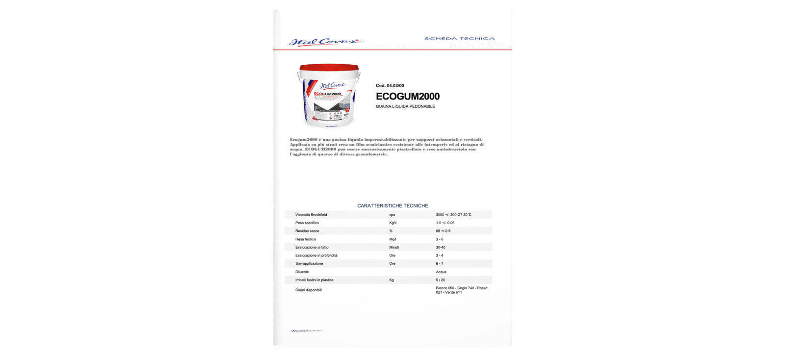 Ecogum2000 è una guaina liquida impermeabilizzante per supporti orizzontali e verticali. Applicata su più strati crea un film semielastico resistente alle intemperie ed al ristagno di acqua. ECOGUM2000 può essere successivamente piastrellato e reso antisdrucciolo con l’aggiunta di quarzo di diverse granulometrie.